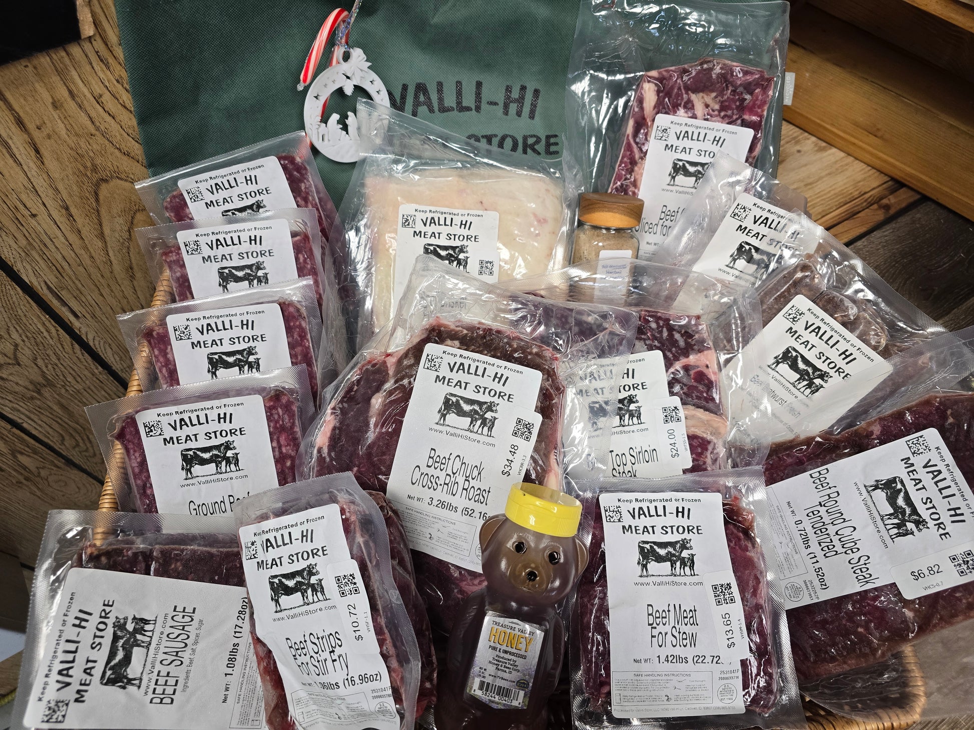 Family Dinners Bag ~ 4 lb Ground Beef, 1 lb Patties, 1 lb Ground Sausage, 1 pkg of Large Sausage Links, 2 Top Sirloin, 1 pkg Carne Asada, 1 pkg Cubed Steaks, 1 pkg Stir Fry/Fajita Meat, 1 pkg Stew Meat, ~ 3 lb Roast, ~ 3 lb Brisket, jar of our Seasoning, Local Honey Bear, and Valli Hi bag with ornament